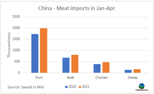 據(jù)梅特國(guó)際集團(tuán)發(fā)布的數(shù)據(jù),2021年前四個(gè)月中國(guó)牛肉進(jìn)口量達(dá)350萬(wàn)噸,較2020年同期增長(zhǎng)了50萬(wàn)噸,增長(zhǎng)了17%。貿(mào)易的增長(zhǎng)主要體現(xiàn)在四種主要肉類上。今年年初羊肉產(chǎn)量很低,現(xiàn)在已經(jīng)回升,比去年同期增長(zhǎng)了28%,在四個(gè)月的時(shí)間里增加了17.4萬(wàn)噸。今年4月,中國(guó)進(jìn)口羊肉5.04萬(wàn)噸,比2020年同月增長(zhǎng)了37%。主要進(jìn)口肉類仍是豬肉進(jìn)口量達(dá)200萬(wàn)噸,同比增長(zhǎng)了15%,牛肉進(jìn)口量81.5萬(wàn)噸,同比增長(zhǎng)了19%,雞肉進(jìn)口量48.8萬(wàn)噸,同比增長(zhǎng)了21%。