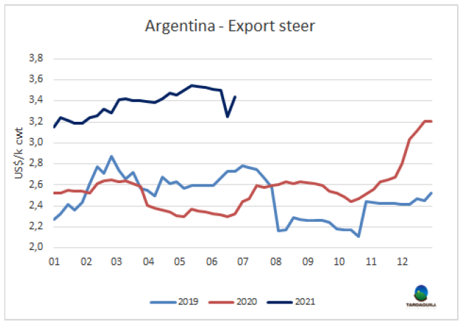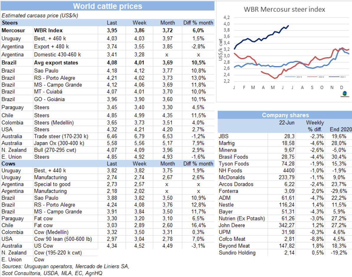 在巴西貨幣政策委員會(huì)上周公布會(huì)議記錄后,美元匯率突破了5雷亞爾的下限,并承認(rèn)基準(zhǔn)利率可能會(huì)以更高的速度上調(diào)。盡管巴西育肥牛的雷亞爾價(jià)格較上周幾乎保持不變,雷亞爾匯率上升1.5%使美元牛價(jià)增長(zhǎng)了7美分至4.08美元/公斤,達(dá)2011年以來最高。阿根廷方面,英國(guó)純種閹牛上周價(jià)格反彈,美元價(jià)格上臟19美分至3.74美元/公斤,包含出口稅。巴拉圭待宰牛價(jià)格上漲了5美分至3.45美元/公斤。烏拉圭市場(chǎng)堅(jiān)挺,參考價(jià)格保持不變,特種閹牛4-4.05美元/公斤。南方工體歐諾個(gè)市場(chǎng)閹牛價(jià)格指數(shù)較上周增長(zhǎng)了9美分至3.95美元/公斤。