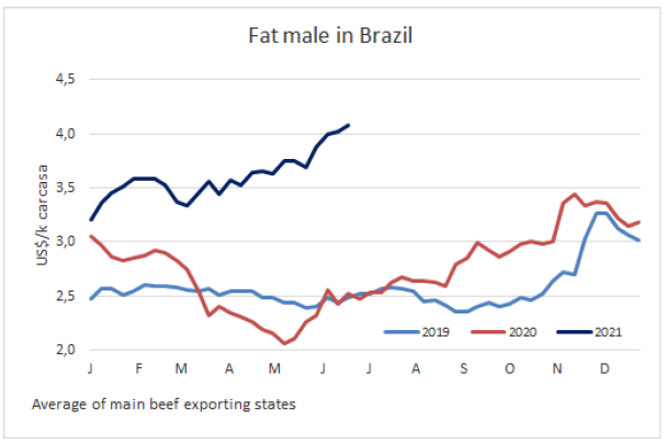 6月巴西牛肉出口節(jié)奏良好,價(jià)格上漲