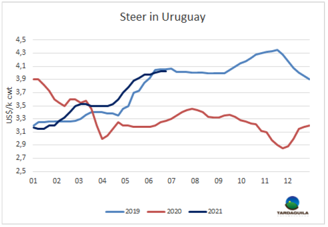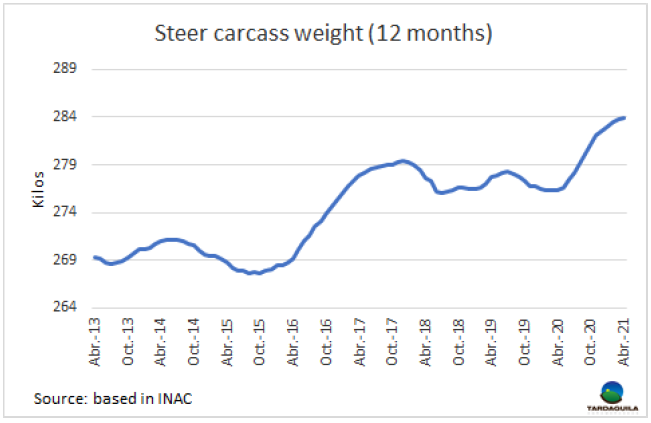 由于出口市場(chǎng)為體重較大的閹牛售價(jià)可觀,閹牛平均胴體重量持續(xù)增長(zhǎng)。截止4月烏拉圭肉協(xié)最近一次發(fā)布的數(shù)據(jù)前的12個(gè)月內(nèi)閹牛平均體重283.9公斤,創(chuàng)新紀(jì)錄。截止2020年4月的12個(gè)月內(nèi)閹牛平均體重276.3公斤,今年4月的平均體重增長(zhǎng)了7.6公斤。牛肉行業(yè)中體重較大的閹牛可以買上更好的價(jià)錢,因此生產(chǎn)者對(duì)此做出反應(yīng)。在胴體重量上上烏拉圭仍需繼續(xù)努力,在美國(guó)等發(fā)達(dá)國(guó)家的牛只平均體重更重一些。澳大利亞的公牛和母牛體重繼續(xù)創(chuàng)新紀(jì)錄,第一季度的體重紀(jì)錄分別為341公斤和281公斤。烏拉圭的閹牛體重比澳大利亞輕57公斤,母牛均重較澳大利亞輕45公斤。
