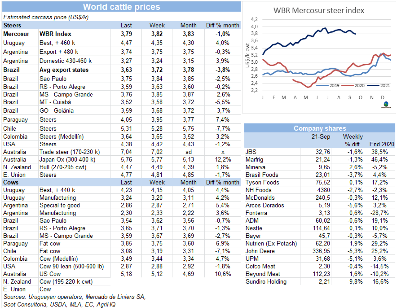 上周三的停工對(duì)肉類加工業(yè)的活動(dòng)產(chǎn)生了影響。INAC報(bào)告稱,在截至9月18日的一周內(nèi),牛屠宰量47168頭,比前一周少7409頭,是自8月1日以來(lái)的最小數(shù)量。不過(guò)仍然遠(yuǎn)遠(yuǎn)高于去年這個(gè)時(shí)候的35000頭。大多數(shù)屠宰場(chǎng)周三沒(méi)有屠宰,在目前的情況下,盡管一周其余幾天的屠宰增加,無(wú)法抵消周三屠宰量的缺口。本周閹牛屠宰量23,662頭(較上周-15%),母牛16,674頭(較上周-15%),小母牛6,134頭(較上周-4%)。屠宰量領(lǐng)先的工廠是Las Piedras(4508頭),美麗華的Pulsa(4475頭)和Canelones(3834頭)。美麗華三個(gè)工廠屠宰量12025頭,較上周減少了1195頭,而Marfrig三個(gè)工廠屠宰了8806頭牛,較上周減少了1928頭。9月前18天,牛屠宰量137683頭,比2020年同期增加了49%。