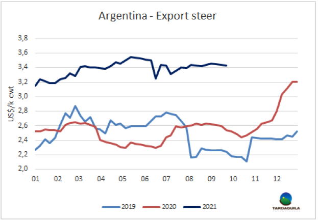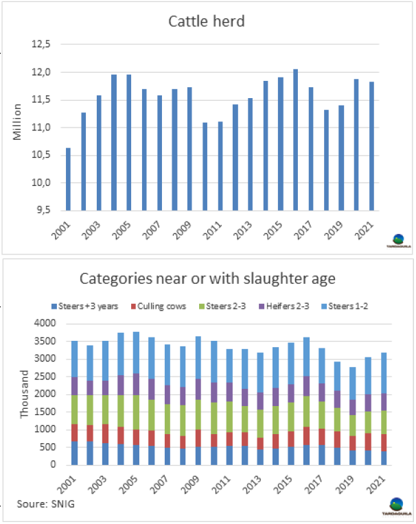 考慮到牛存欄量和畜產(chǎn)面積,每公頃牛存欄量從去年的0.73個(gè)減少到今年的0.72個(gè)。低于過(guò)去10年的平均水平(0.735)。因此,如果從氣候的角度來(lái)看,這一年沒(méi)有重大的氣象災(zāi)害,那么在牧草供應(yīng)方面就應(yīng)該沒(méi)有重大的損失。然而有警告稱,今年是拉尼娜年份,這意味著降雨低于正常水平的可能性更大,主要是在11月至1月期間。