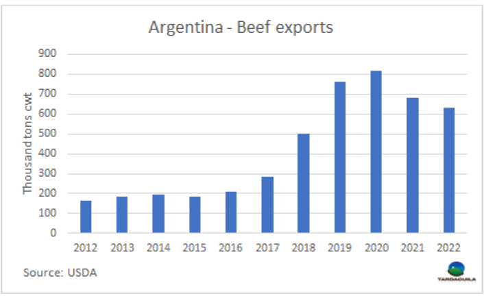 預(yù)計(jì)2022年南美牛肉出口量略有下降