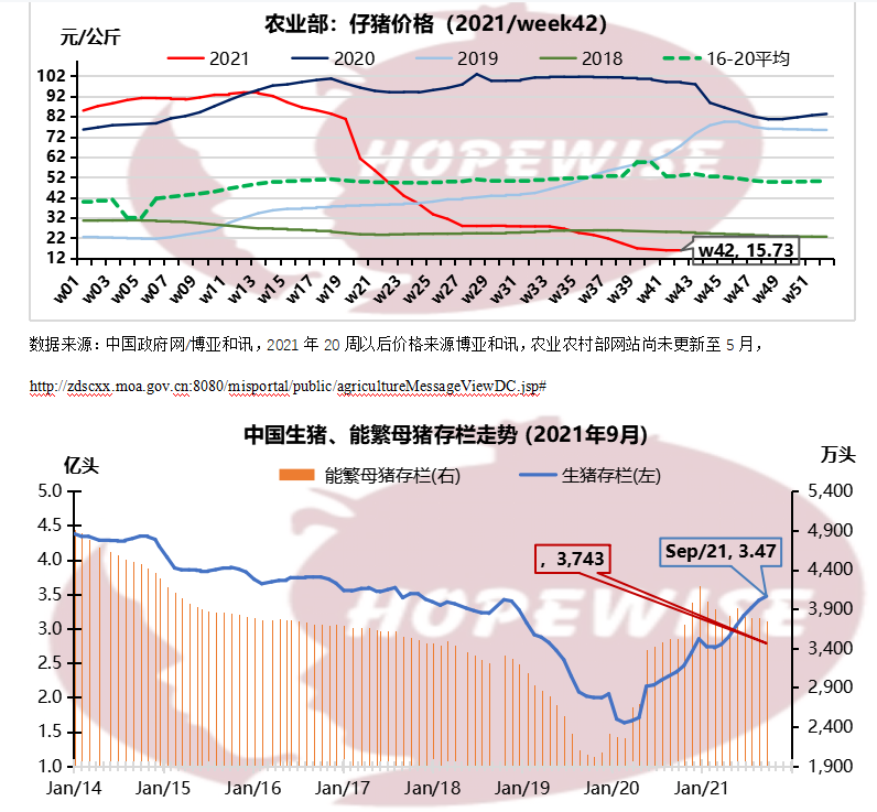 10月國慶節(jié)期間,豬價跌至年內新低,10月5日全國生豬均價跌至10.2元/kg。假期結束以后,生豬價格觸底反彈,10月10日,國家收儲3萬噸,成交價高于市場價,提振市場信心。養(yǎng)殖端久跌盼漲,挺價情緒高漲。到10月21日,全國生豬均價回調至14.25元/kg,較最低點上漲40%。但是,養(yǎng)殖端依然處于虧損狀態(tài)。據博亞和訊預測,4季度外購出欄成本16.5元/kg左右,自繁自養(yǎng)出欄成本16-17.5元/kg。