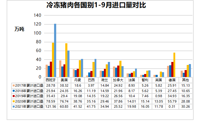 9月,中國主港豬肉進口量30.86萬噸,環(huán)比減少19%,同比減少34%。1-9月,中國主港豬肉進口量404.50萬噸,同比減少4%。進口國別方面,西班牙仍是中國豬肉進口第一大國,累計出口中國121.56萬噸,占中國豬肉進口總量的30%。其次是美國、巴西、丹麥、荷蘭、加拿大、法國、智利、英國、愛爾蘭、墨西哥和奧地利。值得關注的是,巴西豬肉累計出口中國41.75萬噸,超過丹麥,成為中國豬肉進口第三大國。