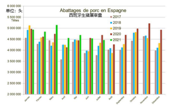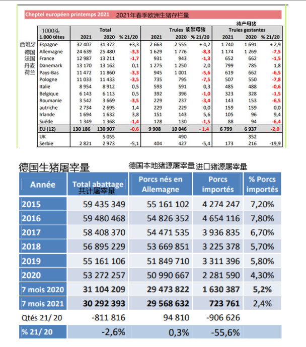 2021年第一季度,歐盟生豬存欄1.30億頭,同比減少0.6%。其中,西班牙生豬存欄3240.7萬頭,同比增加3.3%。德國生豬存欄2463.9萬頭,同比減少3.3%。法國生豬存欄1298.7萬頭,同比減少1.7%。丹麥生豬存欄1317萬頭,同比增加0.1%。荷蘭生豬存欄1147.2萬頭,同比減少3.3%。除了西班牙和丹麥能繁母豬數量同比分別有4.2%和2%的增長,德國、法國、荷蘭能繁母豬存欄均有減少。屠宰量方面,德國1-7月生豬屠宰量3029.2萬頭,同比減少2.6%。西班牙1-7月生豬屠宰量3321.1萬頭,同比+2.71%。其中,7月屠宰446.9萬頭,同比減少4.76%。