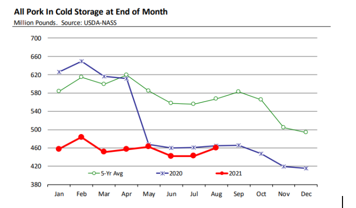 存欄方面,USDA9月1日生豬存欄數據顯示,生豬存欄7540萬頭,環(huán)比增加1%,同比減少4%。能繁母豬存欄619萬頭,同比減少2%,較6月統(tǒng)計的存欄減少0.6%。這是自2013年以來首次9月統(tǒng)計的能繁母豬存欄量低于6月統(tǒng)計的能繁母豬存欄量。預計明年春天和夏天會迎來能繁母豬存欄歷史低位。商品豬存欄6920萬頭,同比減少4%。生豬存欄量同比減少比較明顯的是體重低于120磅的,這些生豬預計在今年冬季出欄,相應的屠宰量預計同比減少6%。