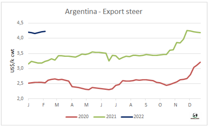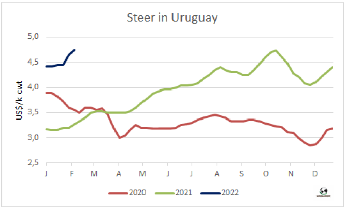 1月烏拉圭對(duì)中國(guó)的平均出口價(jià)格5931美元/噸,比12月的平均價(jià)格低43美元。烏拉圭對(duì)中國(guó)平均出口額連續(xù)11個(gè)月的增長(zhǎng)畫(huà)上句號(hào)。2022年1月的平均價(jià)格同比增長(zhǎng)了49%,這是由于不同部位肉價(jià)格的上漲,去骨部位肉相對(duì)于帶骨牛肉的占比更大。今年1月,烏拉圭對(duì)中國(guó)牛肉出口量占總出口量的76%,其中冷凍牛肉對(duì)中國(guó)出口量占總冷凍牛肉出口量的82%。根據(jù)海關(guān)出口數(shù)據(jù),1月烏拉圭牛肉出口量33167噸,平均價(jià)格為6455美元/噸。盡管出口量較去年12月的峰值下降了20%,但仍比2021年1月高27%。