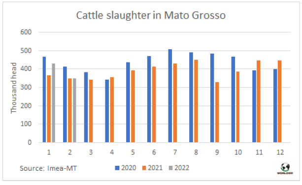 2月馬托格羅索州牛屠宰量下降