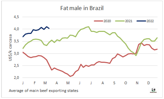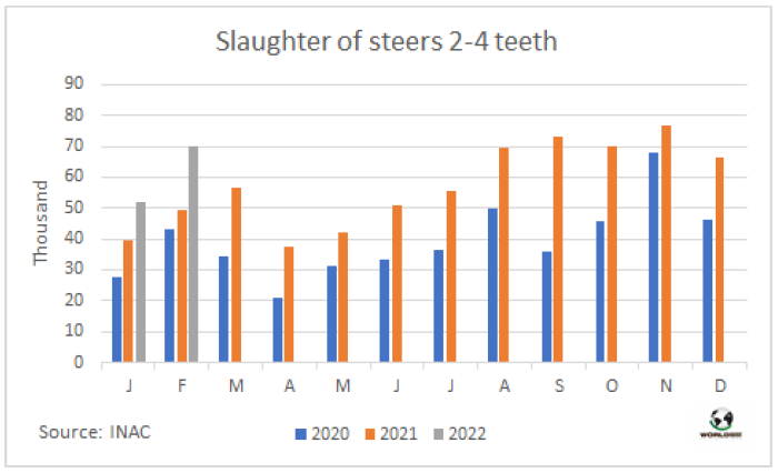 馬托格羅索州是巴西存欄最大的州,2月牛屠宰量和1月相比下降了8.2萬頭(-19%),同比也下降了 3000頭,屠宰量連續(xù)三個(gè)月的增長(zhǎng)結(jié)束。Agrifatto稱,屠宰量下降的主要原因是公牛屠宰量較1月份下降了26.6%,只有18.36萬頭,是35個(gè)月來最低。該咨詢公司推測(cè),屠宰量下降可能由于去年9月對(duì)中國(guó)出口暫停以及2021年最后一個(gè)季度待宰牛價(jià)格下降導(dǎo)致育肥進(jìn)程減緩。母牛屠宰量較上月減少8.6%,為16.47萬頭,母牛屠宰量在中占比增加到47.3%,為24個(gè)月來的最高水平。然而這些數(shù)據(jù)本身并不意味著今年待宰牛供應(yīng)增長(zhǎng)趨勢(shì)的逆轉(zhuǎn)。