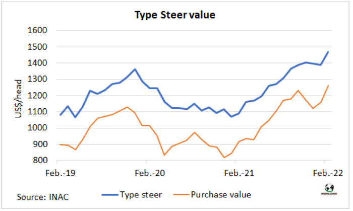 INAC把一頭體重480公斤,出成率54%的牛的銷售價(jià)值成為閹牛類型價(jià)值,2月該指數(shù)達(dá)到了歷史新高1470美元,較上月增加81美元。INAC表示,環(huán)比的增長(zhǎng)是由于“出口部位肉和到國(guó)內(nèi)市場(chǎng)的東西銷售價(jià)值增長(zhǎng),部分抵消了內(nèi)臟和副產(chǎn)品價(jià)值的下降,而鮮皮的價(jià)格保持穩(wěn)定?!北驹禄钆2少?gòu)價(jià)格上漲了105美元,達(dá)1264美元,因此工業(yè)增加值(兩者之間的差額)收縮至206美元/頭,僅為閹牛類型價(jià)值的14%。