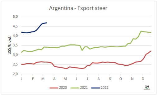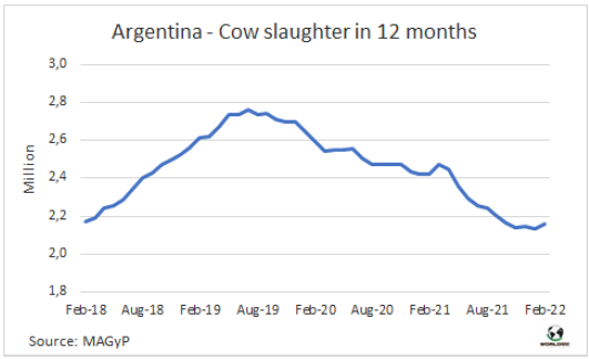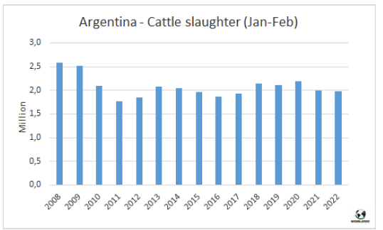 據(jù)農(nóng)業(yè)部估算,今年2月阿根廷牛肉產(chǎn)量23.2萬噸,2022年前兩個(gè)月產(chǎn)量合計(jì)45.4萬噸。單月看有所差異,但1-2月合計(jì)牛肉生產(chǎn)量與去年同期持平。2月人均消費(fèi)量51公斤,1-月人均消費(fèi)量48公斤,比2021年同期增長(zhǎng)8%。