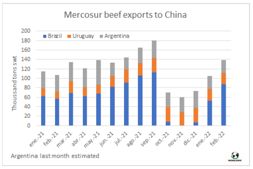 今年2月,南方共同市場(chǎng)國(guó)家向中國(guó)出口了近14萬噸的牛肉,環(huán)比增加3.4萬噸,同比也有所增加,這是自去年9月以來從未出現(xiàn)過的情況。這一增長(zhǎng)是由于來自巴西的銷售強(qiáng)勁擴(kuò)張,在12月15日重新開放后,巴西已經(jīng)恢復(fù)了發(fā)貨速度。巴西2月的出口量為8.7萬噸(比1月份多3.4萬噸),而烏拉圭的出口量仍在2.5萬噸左右。據(jù)估計(jì),阿根廷的出口量在2.7萬噸上下擺動(dòng),與1月的出口量相當(dāng)。2月從南方共同市場(chǎng)運(yùn)出的這些貨物將在3月中旬至4月下半月抵達(dá)目的地。南方共同市場(chǎng)占中國(guó)進(jìn)口牛肉供應(yīng)的75%。今年2月從澳洲進(jìn)口量27,265噸 (新西蘭15,734噸,澳大利亞11,531噸)。另一個(gè)重要的供應(yīng)國(guó)是美國(guó),1月美國(guó)出貨量為16156噸,目前還沒有2月的數(shù)據(jù)。