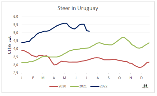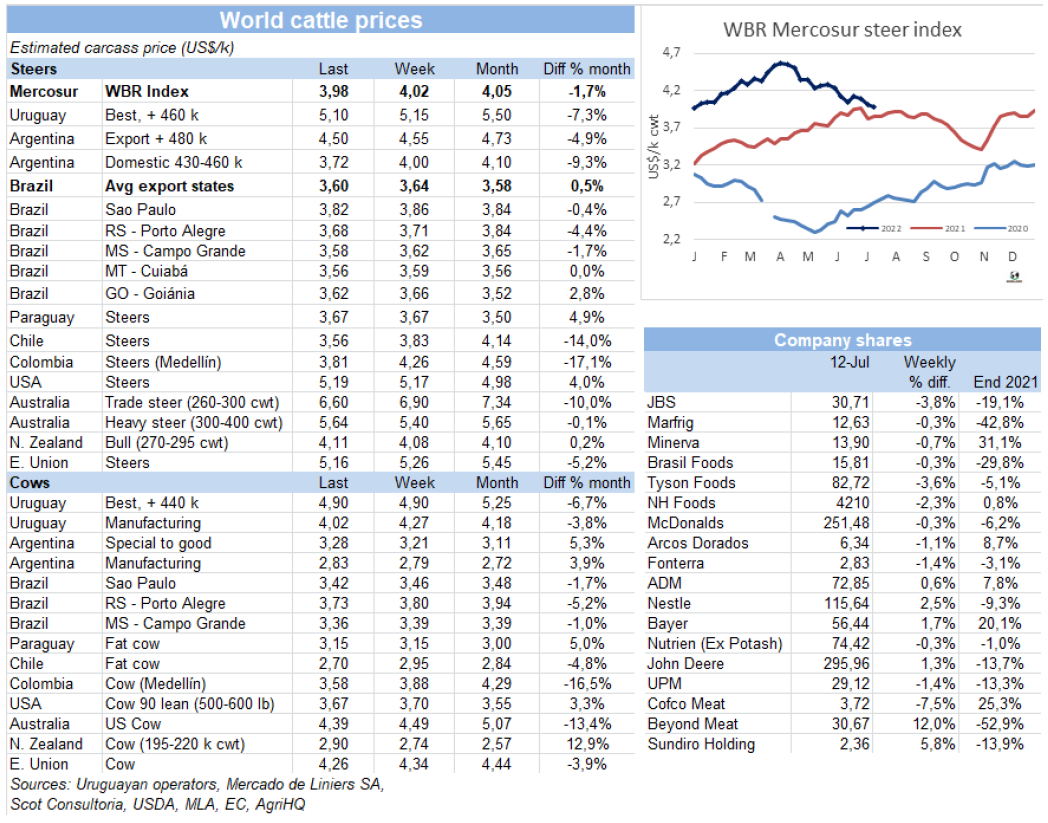 五家工廠暫停屠宰活動加上一些還在進(jìn)行屠宰活動的工廠減產(chǎn),導(dǎo)致牛屠宰量下降至2020年末至今一年半以來的最低水平。烏拉圭肉協(xié)報告,截止7月9日,一周內(nèi)牛屠宰量29829頭,環(huán)比減少了1萬多頭,減幅約25%。同比減少了2.1萬頭,減少了42%。屠宰量較上周下降是由于閹牛屠宰量下降了約28%至14561頭,母牛屠宰量較上周下降了17%至10506頭。小母牛屠宰量下降了17%至4297頭。屠宰量最高的工廠是Las Piedras,379廠,屠宰量 5022頭, Marfrig-Cledinor,394廠,屠宰量 3180頭和Ontilcor 439廠,屠宰量3,041頭。美麗華三家屠宰場屠宰量累計6553頭,Marfrig兩家屠宰場累計屠宰量5735頭。本周烏拉圭2廠,104廠等一些上周暫停的屠宰場恢復(fù)屠宰, 12廠,344廠,310廠仍未恢復(fù)屠宰。美麗華7廠屠宰持續(xù)至昨天,將暫停屠宰直至八月中旬。本周屠宰量將繼續(xù)保持低水平,不過將較前一周的低點(diǎn)有所提高。