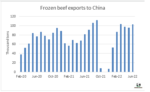 六月主要牛肉出口國對中國牛肉出口量巨大