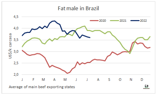 六月馬托格羅索州牛屠宰量44.55萬頭,環(huán)比增長了2萬頭,同比增長了3.4萬頭。公牛屠宰量24.9萬頭,母牛屠宰量19.7萬頭。公牛屠宰量與2021年6月基本持平(-0.4%),母牛屠宰量增加了3.5萬頭。母牛屠宰量的增長證實(shí)了巴西正從2020年和2021年的保留存欄階段轉(zhuǎn)向降低存欄階段。但是,據(jù)Agrifatto表示,今年巴西正處于這兩個周期階段之間的過渡時期,該機(jī)構(gòu)預(yù)測,到2023年母牛屠宰量將高于今年。馬托格羅索州是巴西屠牛量最大的州,約占總屠宰量的20%。