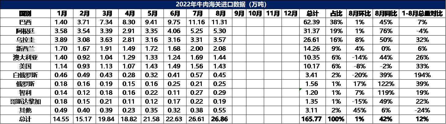 2022年1-8月冷凍牛肉進口數(shù)據(jù)