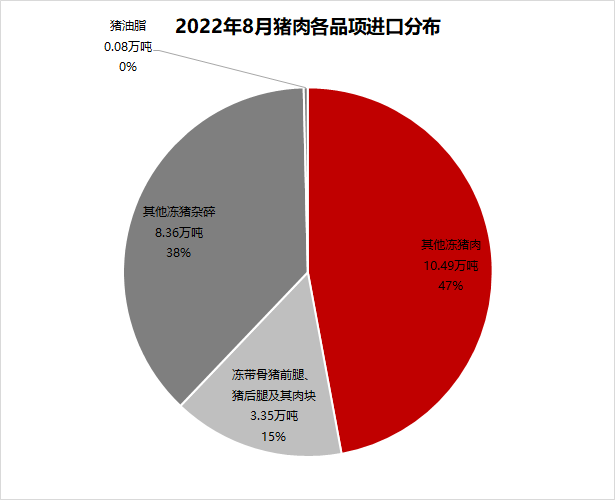 從8月豬肉進口品項看,其他凍豬肉和其他凍豬雜碎的進口量之和占豬肉進口量的85%。豬主塊肉類和豬脂肪類進口量占比較7月變化不大。