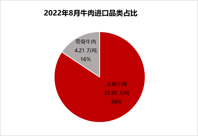 從牛肉進口品項看,帶骨牛肉占比基本沒有變化。8月去骨牛肉進口量22.65噸,占84%,帶骨牛肉進口量4.21萬噸,占16%。