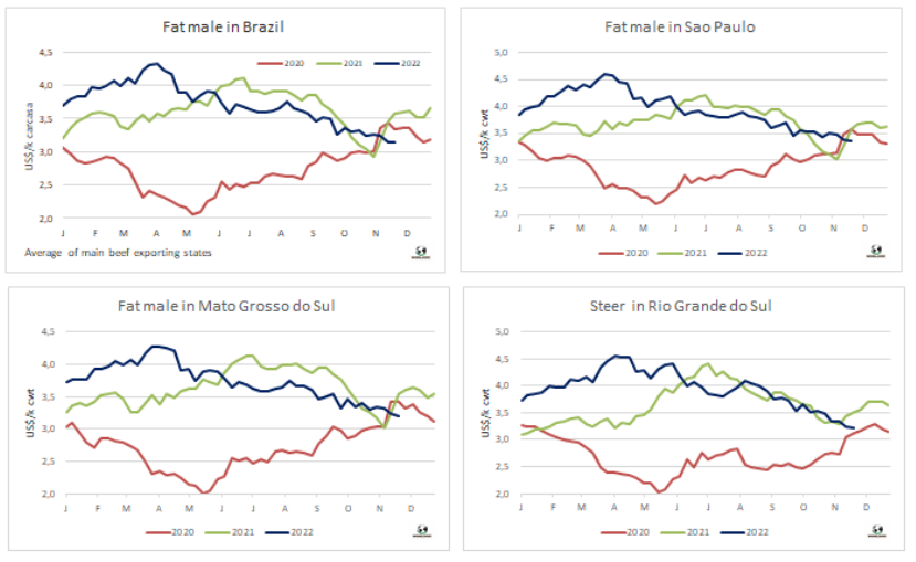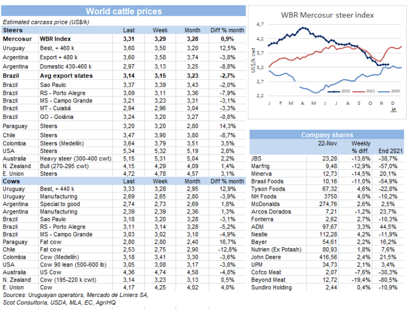 今年下半年,南美國家牛肉價格下跌,但谷物價格仍居高不下。這將導(dǎo)致南美國家減少育肥投入,從而導(dǎo)致2023年前幾個月育肥牛供應(yīng)下降。烏拉圭集約化養(yǎng)殖者協(xié)會(Aupcin)主席álvaro Ferrés告訴WBR,“有些人開始擔(dān)心2023年第一季度供應(yīng)減少。如果未來幾個月牛價上漲,育肥場的供應(yīng)狀況可能會改善,”從成本方面來看,由于動物飼料價格仍維持在高位,且雨后預(yù)備牛價格穩(wěn)定,預(yù)計不會出現(xiàn)大幅下降??紤]到草飼牛的銷售旺盛,直到年中,以及由于缺水而導(dǎo)致的牧草狀況不佳,Ferrés認(rèn)為“必須進(jìn)行谷飼育肥才能得到成品牛?!蹦厦赖貐^(qū)其他國家情況也類似。巴西方面,根據(jù)Cepea的說法,“目前的情況不適合圍欄牧場育肥?!卑⒏⒎矫妫帮暳蠄龅默F(xiàn)狀很差,”阿根廷育肥場協(xié)會(CAF)主席Fernando Storni告訴WBR。巴拉圭方面,近幾個月來育肥牛價格的暴跌導(dǎo)致飼養(yǎng)場每頭牛虧損100至200美元,因為架子牛的采購價格非常高。作為全球牛肉的主要供應(yīng)商,南方共同市場在2023年的頭幾個月可能會出現(xiàn)供應(yīng)減少,特別是牛齡較小的育肥牛。這是一個很重要的信息,因為巴西只能向中國出口屠宰時牛齡小于30個月的牛肉。