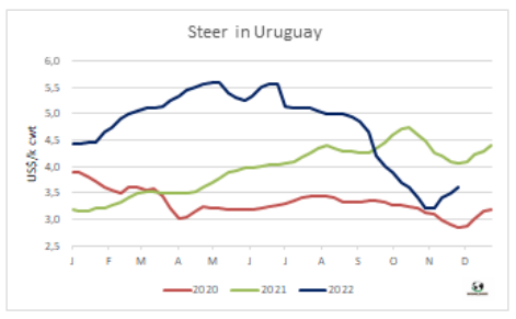 降雨條件的改善進(jìn)一步使草飼成品牛供應(yīng)減少,而一些工廠的潔食團(tuán)隊的到來導(dǎo)致對體重較重的牛需求增加,無論是閹牛還是母牛,供應(yīng)不足。需求端情況各異,不進(jìn)行潔食屠宰的工廠保持更謹(jǐn)慎的態(tài)度,但是,盡管出價有點(diǎn)低,他們也在跟隨市場趨勢。周日至周一期間,烏拉圭大部分地區(qū)再次迎來了充沛的降雨,這無疑提高了對夏季降水的預(yù)期。重閹牛成交價3.6美元/公斤,對體重較輕的育肥牛需求也有所增長,賣到國內(nèi)市場的閹牛和小母牛需求增加。從巴西牛肉進(jìn)口量下降,因此對國內(nèi)牛肉消費(fèi)量增加。重母牛報價3.3美元/公斤,預(yù)訂活躍,7天交貨。預(yù)計市場需求將持續(xù),價格的上漲趨勢得以鞏固,國際市場應(yīng)該會看到更清晰的漲跌信號。