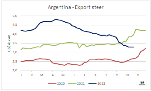 過去五周,南方共同市場待宰牛的均價基本保持穩(wěn)定,在3.28-3.31美元/公斤美元之間波動。上周,南方共同市場閹牛價格指數(shù)上漲了2美分,至3.31美元/公斤。巴西方面育肥牛雷亞爾價格有小幅上漲,但被0.7%的匯率跌幅逆轉(zhuǎn),主要出口市場育肥牛價格下跌了1美分至3.14美元/公斤。阿根廷方面,出口閹牛美元價格上漲2美分至3.6美元/公斤。烏拉圭本周牛價繼續(xù)上漲,與阿根廷參考價相當(dāng),3.6美元/公斤。巴拉圭待宰公牛價格保持3.2美元/公斤。