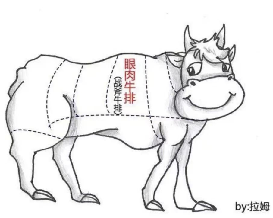 眼肉,也叫肋眼,英文是Rib Eye或Cube Roll,是整頭牛身上最經(jīng)典的牛排部位,也是判斷整頭牛雪花紋理等級(jí)的標(biāo)桿部位,屬于高檔肉,是一等類肉的代表。它位于牛的肩部,牛背上兩側(cè)前面,牛脊背第七根至第十根肋骨之間,牛上腦肉與牛外脊肉之間的那塊肉。牛眼肉外形酷似眼睛,因而得名。
