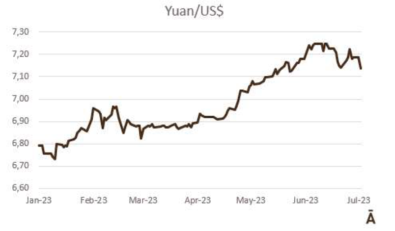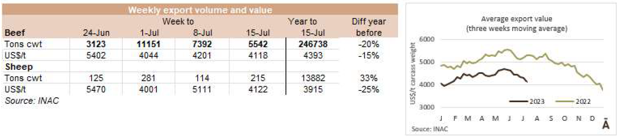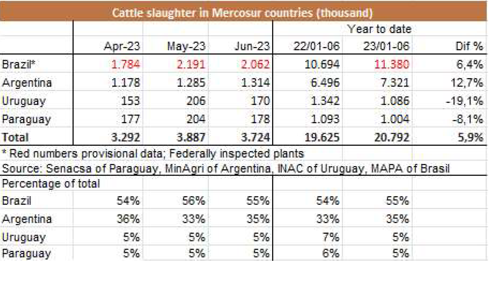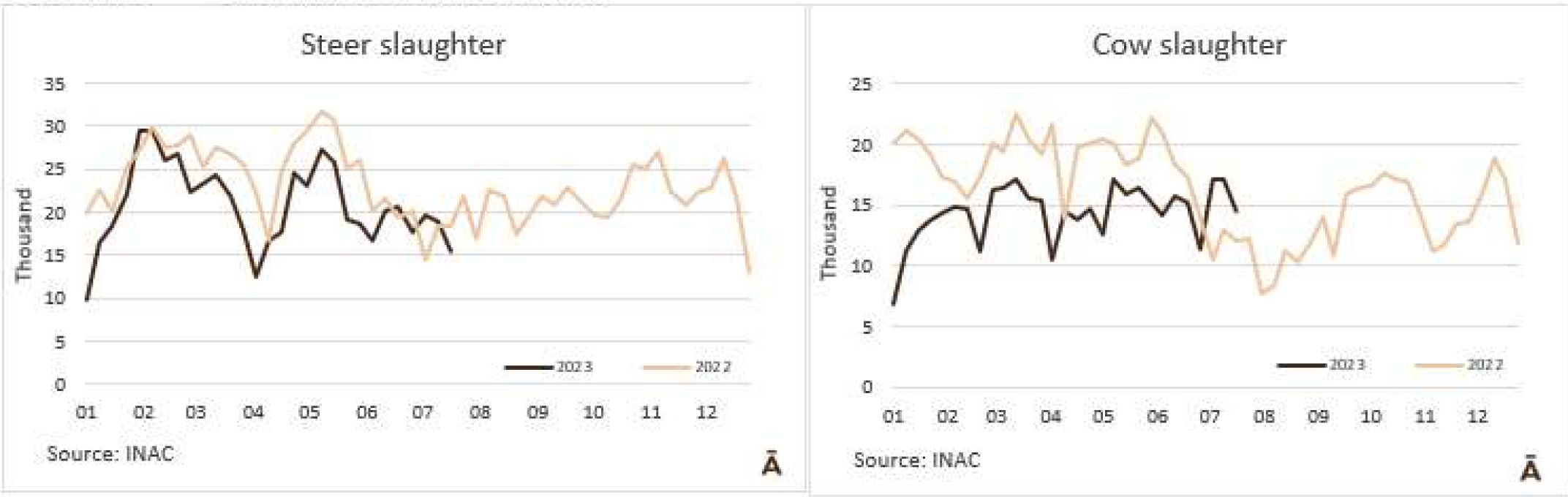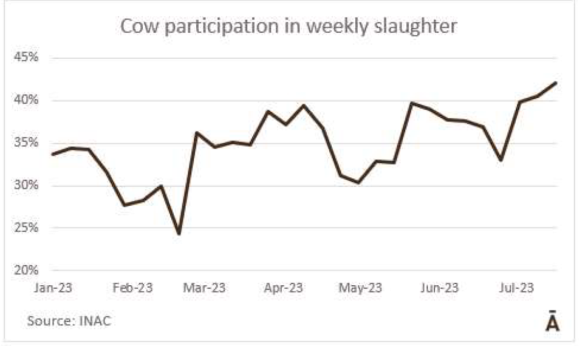 由于7月18日的非工作假期,上周的牛屠宰量下降約7500頭,與去年非常相似(-1%)。INAC報告稱,有34637頭牛進入工廠。奶牛周減少量為15%(14576頭),是減少比例最小的。奶牛屠宰量占總量的42.1%,是今年迄今為止的最高比例。另外15416頭公牛(周減少量為-18%)和3959頭小母牛(周減少量是29%)被屠宰。屠宰量最大的公司是Marfrig-Takuaremb6(3971),Minerva、Pulsa(3625)和Carrasco(3513)。Marfrig在一周內(nèi)屠宰了8710頭牛,而Minerva和另外兩個工廠這周屠宰了7138頭牛。7月份的前22天,牛屠宰數(shù)量達到121942頭,比2022年同期高14.4%。這樣一來,本月的屠宰量肯定會出現(xiàn)強勁的收縮趨勢。連續(xù)13個月下降后,與上年同月相比首次出現(xiàn)增長。