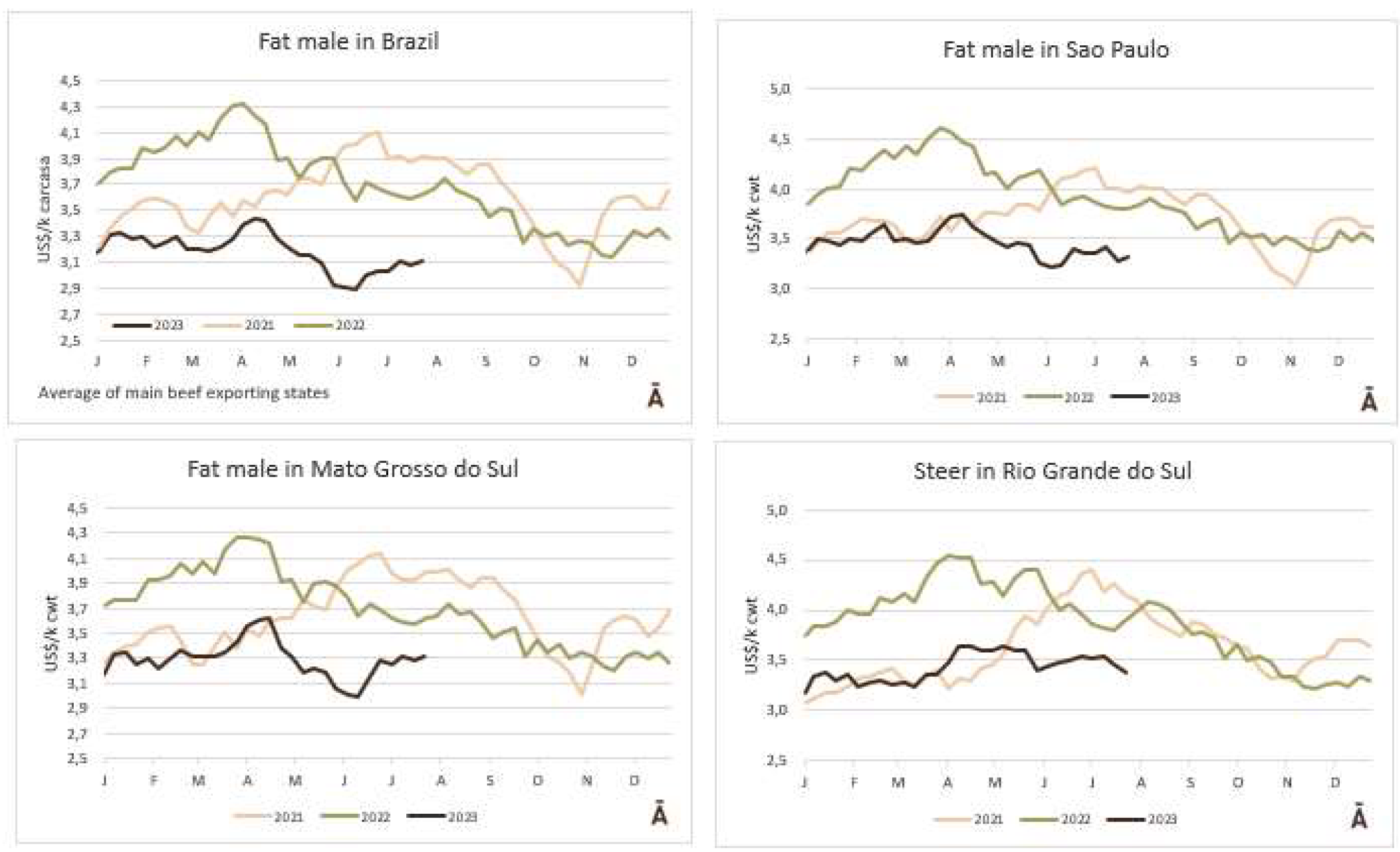 經(jīng)過前一周的下調(diào),本周巴西主要養(yǎng)牛區(qū)的屠宰牛價格保持穩(wěn)定。圣保羅州普通育肥牛平均價格是236.5雷亞爾/15公斤,出口中國市場30月齡以下的育肥牛價格高10雷亞爾/15公斤。巴西主要的牛市場價格與上周保持一致;批發(fā)市場的牛肉庫存給宰牛的價格造成了下行壓力。8月初,隨著父親節(jié)需求的增加,價格預計會上漲。