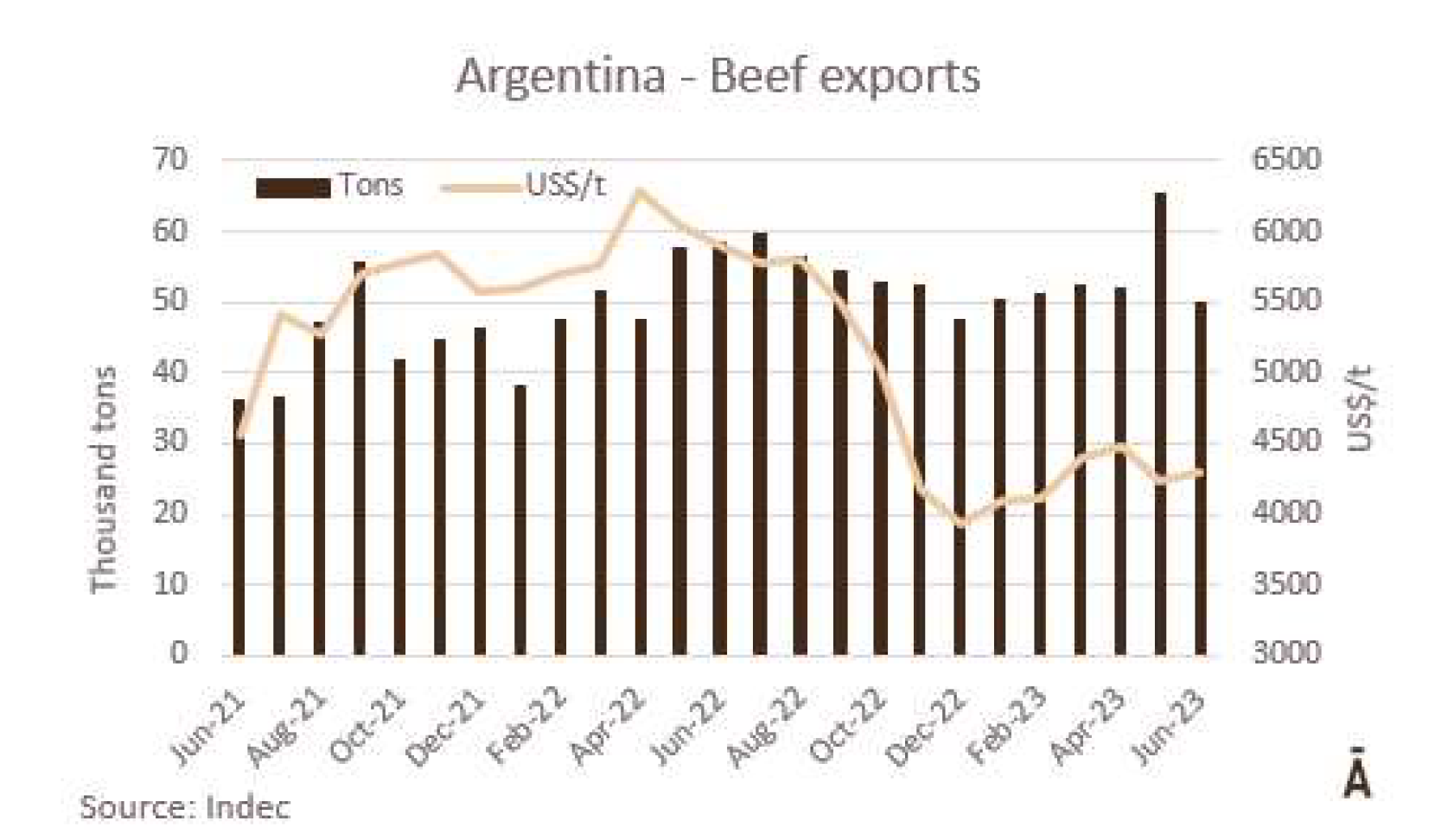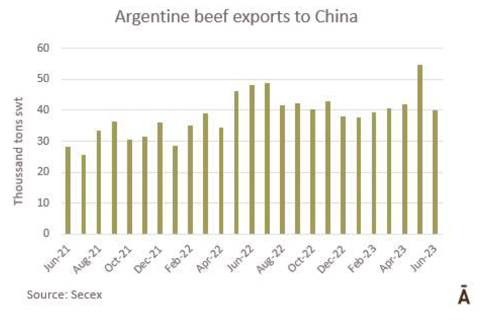 6月份冰鮮、冷凍和加工牛肉的出口總量略高于5萬噸(4.1萬噸肉和0.9萬帶骨肉)。根據(jù)統(tǒng)計,這是2023年迄今為止的最低月產(chǎn)量,比去年5月低24%,比6月低15%。SENASA衛(wèi)生服務部門的數(shù)據(jù)顯示六月份出口量比5月高,差異“主要是運往中國的數(shù)量上,實際上比預計少1萬噸。” 據(jù)美國廣播公司報道,“牛肉屠宰和生產(chǎn)一直處于高水平,6月份出口量的意外下降,主要是由于在支付國外運費方面出現(xiàn)了困難。就貨值而言,6月份的出口額接近2.15億美元,比上月降低22.5%,比去年的3.46億美元降低了38%。