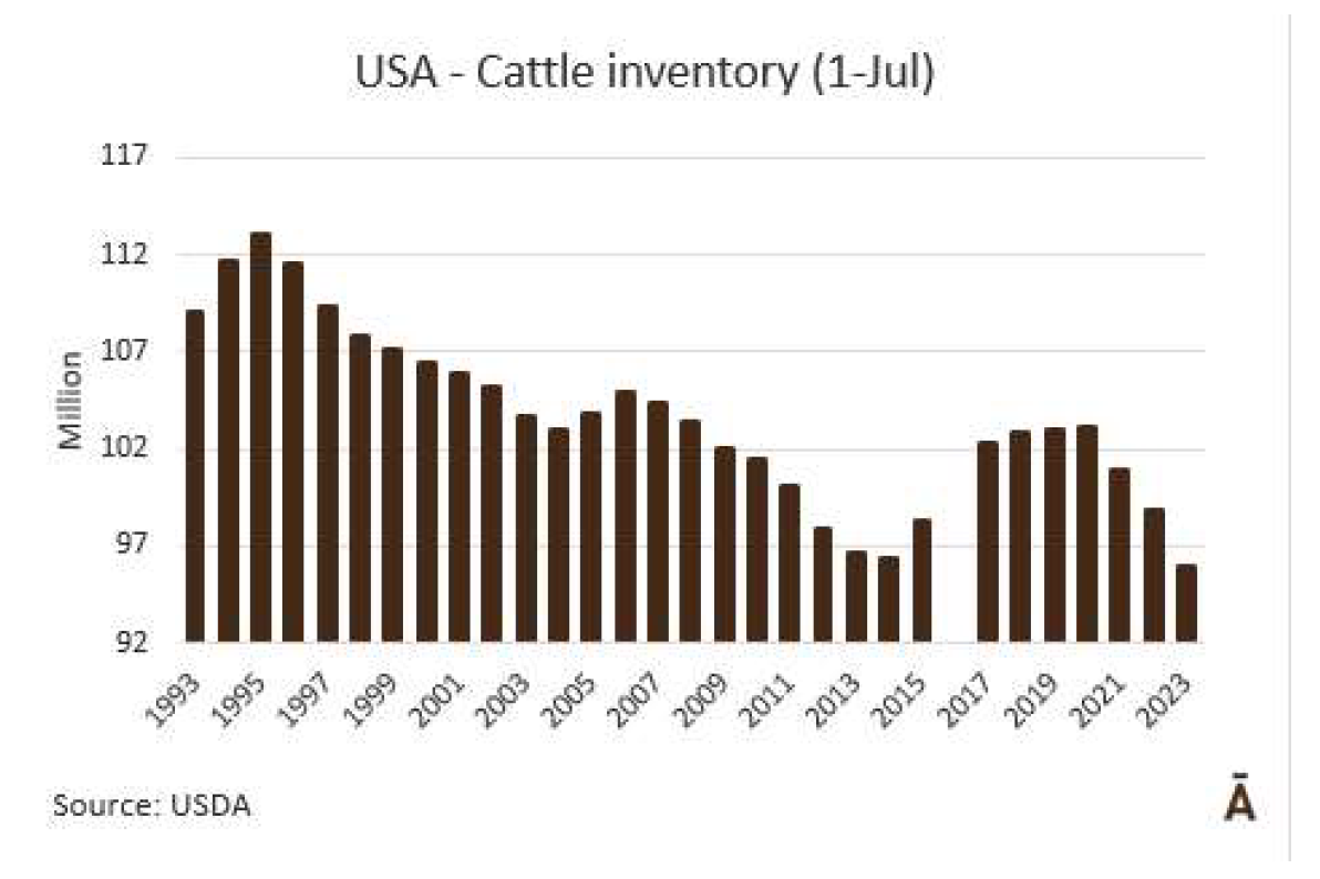 美國農(nóng)業(yè)部國家農(nóng)業(yè)統(tǒng)計局稱7月 1日牛庫存的數(shù)量是9590萬頭,比去年的9860萬頭低3%,是自1971年以來最小的庫存。所有奶牛和小母??傆?/span>3880萬頭,比2022年7月1日的3960萬頭低2%。2940萬頭的肉牛比一年前減少了3%。奶牛數(shù)量為940萬頭,與前一年相比沒有變化。
