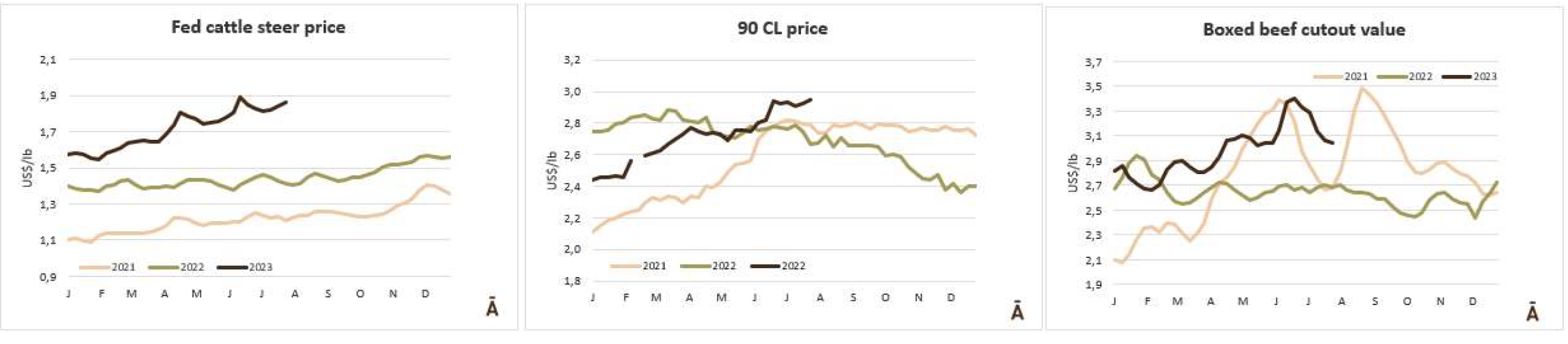 與前一周相比,北部地區(qū)活牛成交價上漲了2美元至188美元/百榜,屠宰牛成交價上漲了5美元至295美元/百磅。南部地區(qū)活牛參考價180美元/百磅,較之前有2美元/百磅的上漲。