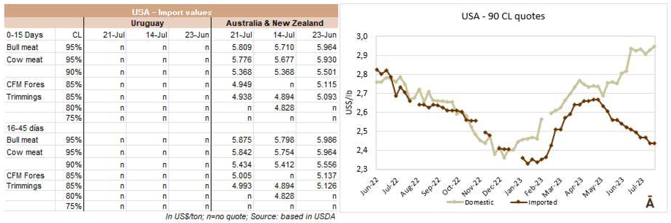 烏拉圭的美國進口市場對牛肉砌塊保持著“良好的需求”,90CL的牛前非配額銷售價格是CFR4000美元,95CL是4200美元,85CL是3600美元。