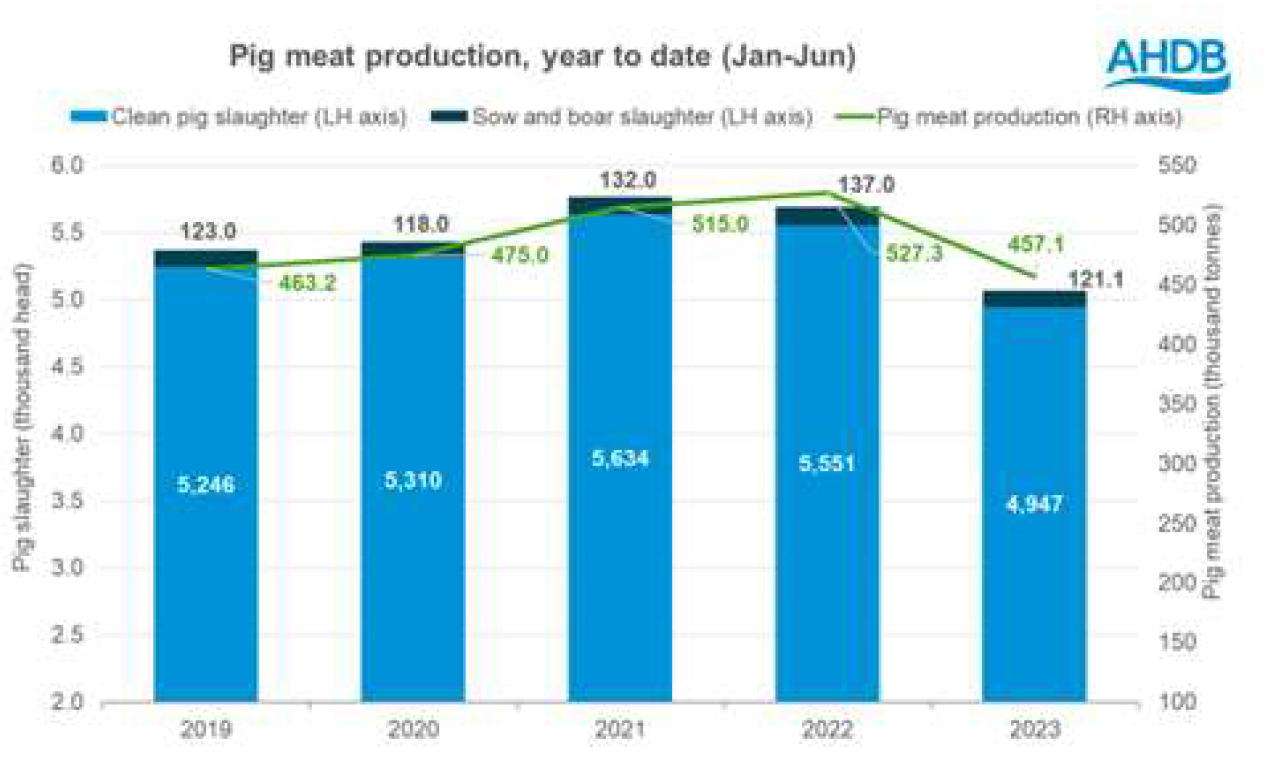 由于產(chǎn)量大幅下降,英國豬肉市場繼續(xù)保持非常緊張的供應。這意味著生豬價格保持不變,但生豬屠宰場的屠宰量變少。6月份,豬肉產(chǎn)量達到74700噸。與2022年5月相比,產(chǎn)量下降了7%,與6月相比產(chǎn)量下降了11%。屠宰量達到813700頭,比5月份減少6%,比2022年減少11%。六月份胴體的重量也有所下降,為88.3公斤。今年迄今(1月至6月),英國豬肉總產(chǎn)量達到45.71萬噸,比去年上半年的產(chǎn)量低13%,是2017年以來的最低產(chǎn)量。這主要是由于屠宰量較低,今年前六個月屠宰495萬頭。這比去年下降了11%,也是自2013年以來的最低數(shù)字。
