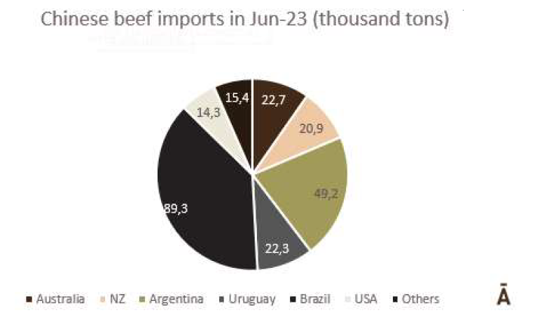 6月份,234065噸牛肉運抵中國,其中6288噸為冰鮮肉類,227777噸為冷凍牛肉。根據(jù)中國海關(guān)數(shù)據(jù),冰鮮牛肉的平均進口價格為11063美元/噸,而冷凍牛肉的進口價格達到5356美元/噸。南方共同市場國家占總量的69%,89345噸來自巴西,平均價格為5400美元/噸,49195噸來自阿根廷,價格為4485美元/噸,22135噸來自烏拉圭,價格為4197美元/噸。就冰鮮牛肉而言,52%來自澳大利亞,平均價格為10753美元/噸。