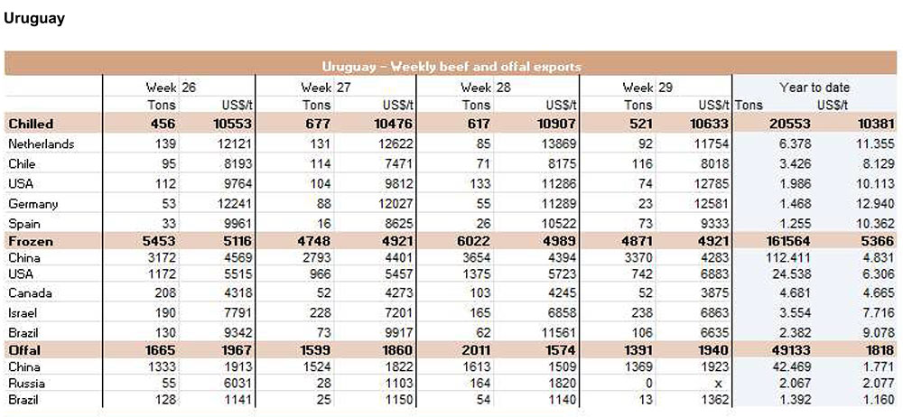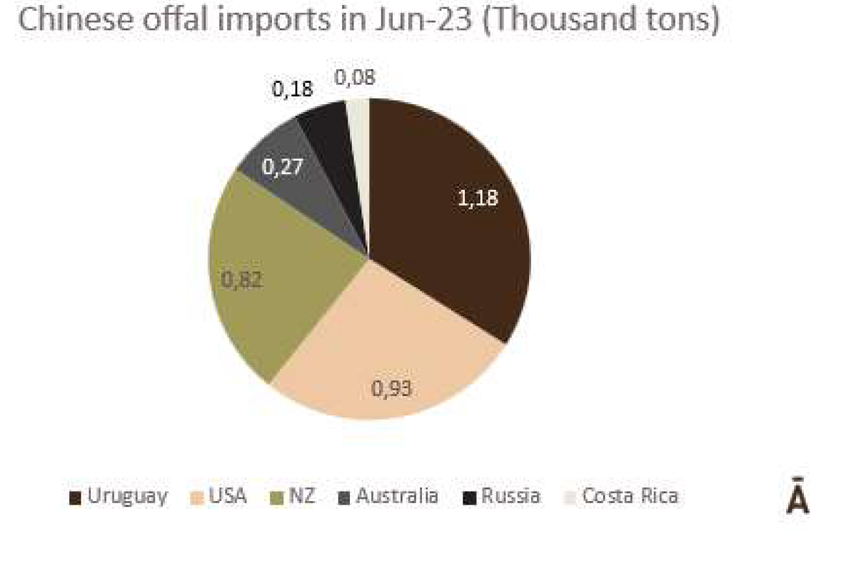 6月份,中國進口了3471噸牛內(nèi)臟,其中1178噸(34%)來自烏拉圭。巴西和阿根廷的內(nèi)臟不能直接進入中國市場。6月份排名靠前的其他兩位供應商是美國(27%)和新西蘭(24%)。從烏拉圭進口的內(nèi)臟平均價格為5485美元/噸,而從美國進口的內(nèi)臟平均價格是4897美元/噸,從新西蘭進口的內(nèi)臟價格為6014美元/噸。