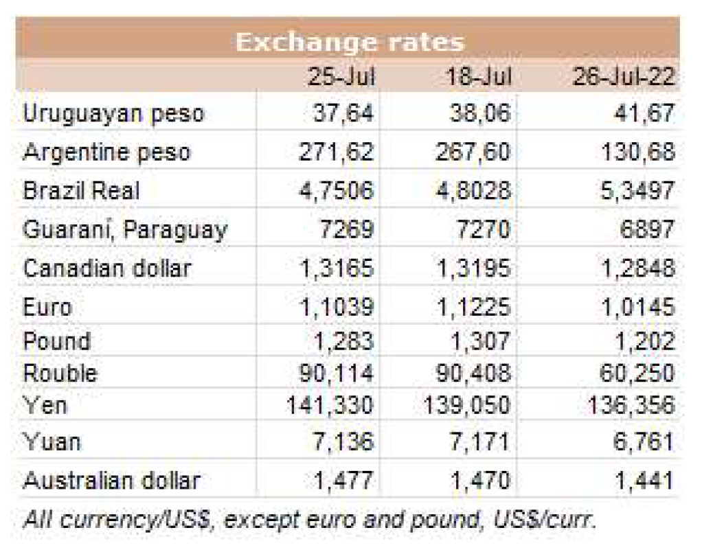 一位貿(mào)易商稱,智利進口市場保持著控制“邊境開放的情況下貨物的具體到貨量”的節(jié)奏。 他補充道,烏拉圭和巴西的19-20分體價格是CIF 5400-5600。消息人士評論道:“智利人正在等待市場吸收即將到來的東西,以便在國慶節(jié)期間外出購買,今年的國慶節(jié)會有點復雜?!?。