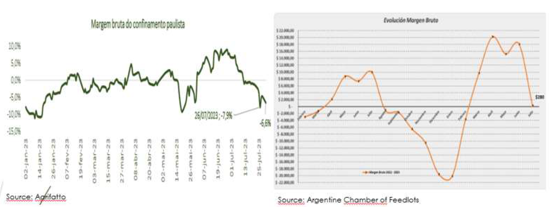 一位分析師稱,適合出口到中國的??赡軙p少,但無論如何,供應(yīng)都不會減少,飼養(yǎng)場的牛數(shù)量將達到700萬頭。在圣保羅,飼養(yǎng)場7月份的數(shù)字為負(fù)數(shù),26日達到7.9%。盡管玉米價格明顯下降,牛的價格保持相對較低,被送往屠宰場牛的價格下跌使數(shù)字變紅。阿格里法托說:“隨著10月23日育肥牛的價格將降至249雷亞爾/15公斤以下,超過了過去60天16%的成本下降,飼養(yǎng)場毛利率顯示負(fù)數(shù)。因此,預(yù)計10月和11月屠宰的動物數(shù)量會減少是合理的。