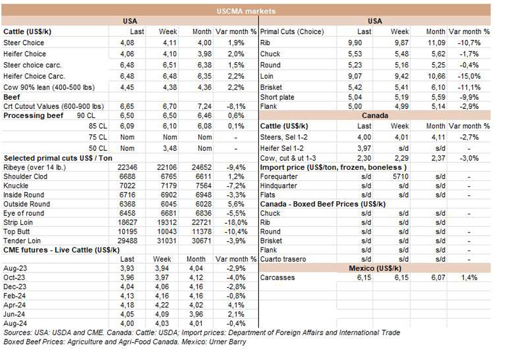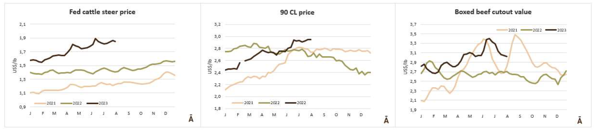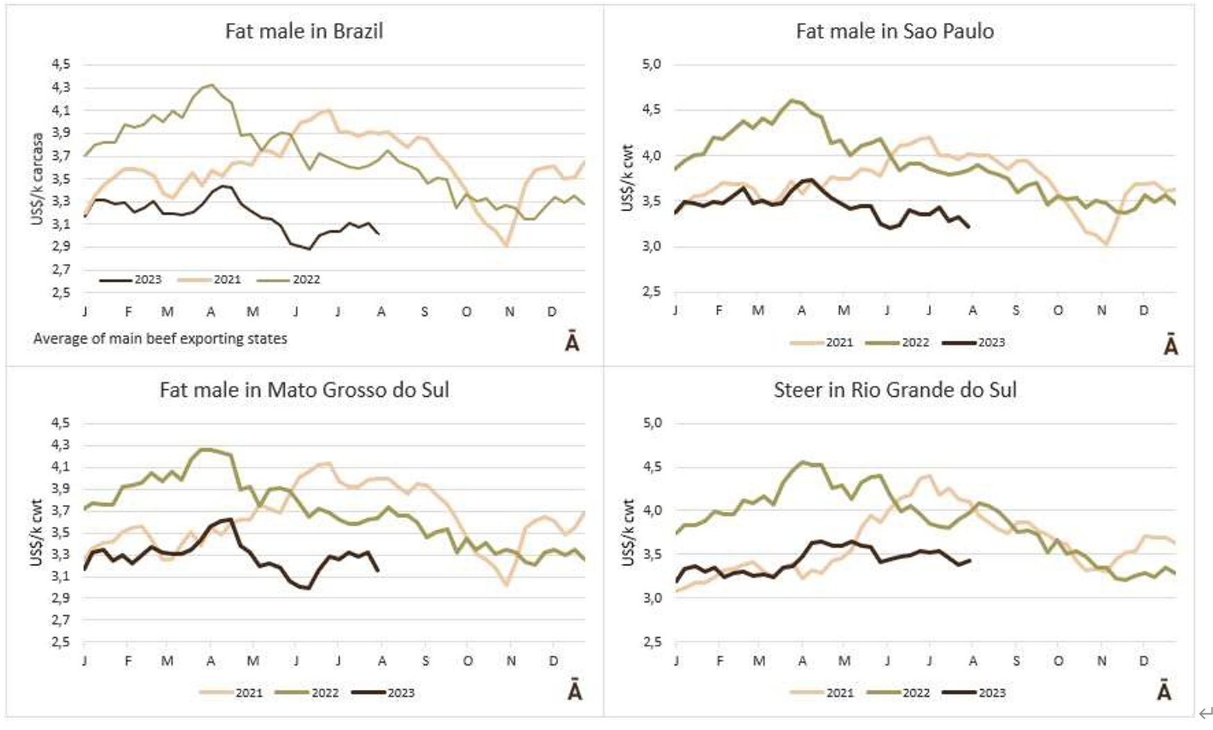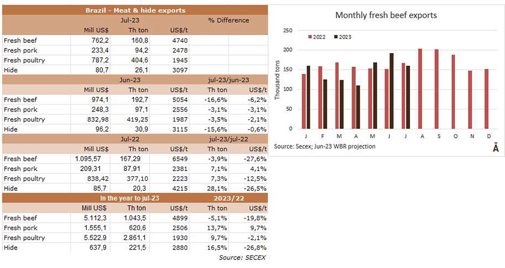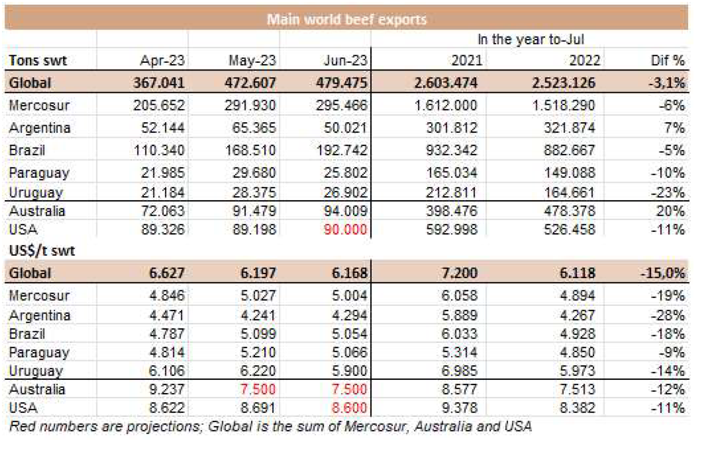 根據(jù)外貿(mào)部(SECEX)的信息,巴西7月份出口了160795噸牛肉,平均價值為4740美元/噸。與6月份相比,產(chǎn)量減少了近3.2萬噸,但同比僅減少了6.5萬噸。平均出口價格在月度比較中下降6.2%,在年度比較中下降27.6%。因此,與去年同月相比,巴西的出口量在5月和6月出現(xiàn)了復(fù)蘇。今年至7月份,巴西出口了104萬噸牛肉,比2022年同期減少了5.6萬噸(-5.1%);與每噸4899美元相比,平均出口價格下降了20%。