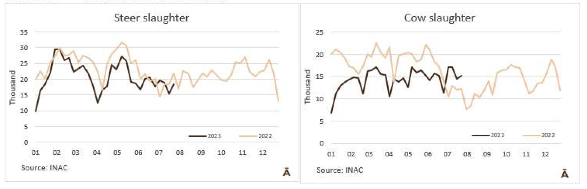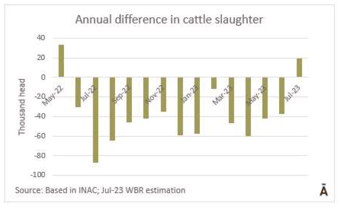 根據(jù)SENASA臨時數(shù)據(jù),7月份的屠宰許可包括129萬頭牛,比前一個月減少了1%,但是比一年前增加了14%。年度增幅最大的品種是小母牛(26%),其次是奶牛(19%)和幼牛(16%),對公牛的屠宰沒有改變。與5月和6月的比例一致,7月母牛屠宰比例為48.7%,比去年同月增加了三個百分點。