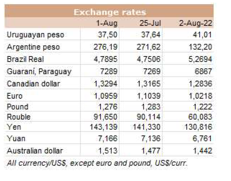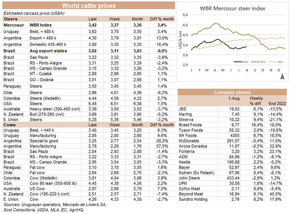 阿根廷出口公牛的價格本周爆炸式增長了50美分至每公斤酮體4.30美元(包括9%的出口稅)。而巴西恰恰相反,那里的包裝公司被收購以此壓低價格。出口州的平均每公斤損失9美分至每公斤3.02美元,成為該地區(qū)的最低價格參考值。烏拉圭的牛的價格也面臨下行壓力,主要是質(zhì)量最重、最好的公牛,價格為3.60美元左右。在巴拉圭,良好的飼料條件要求牛肉維持3.50美元左右的市場價格。