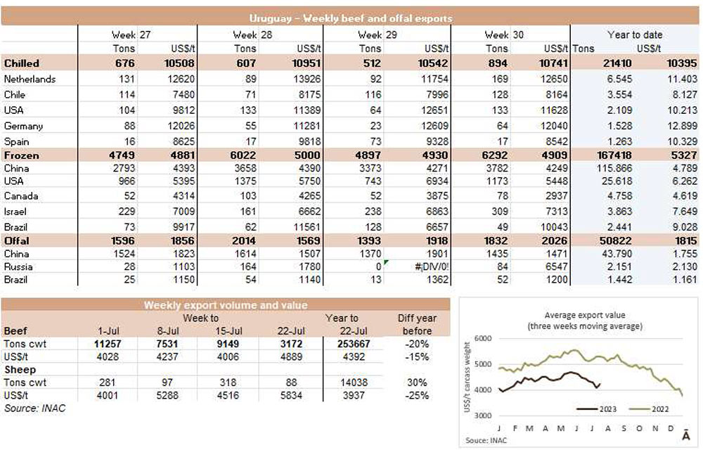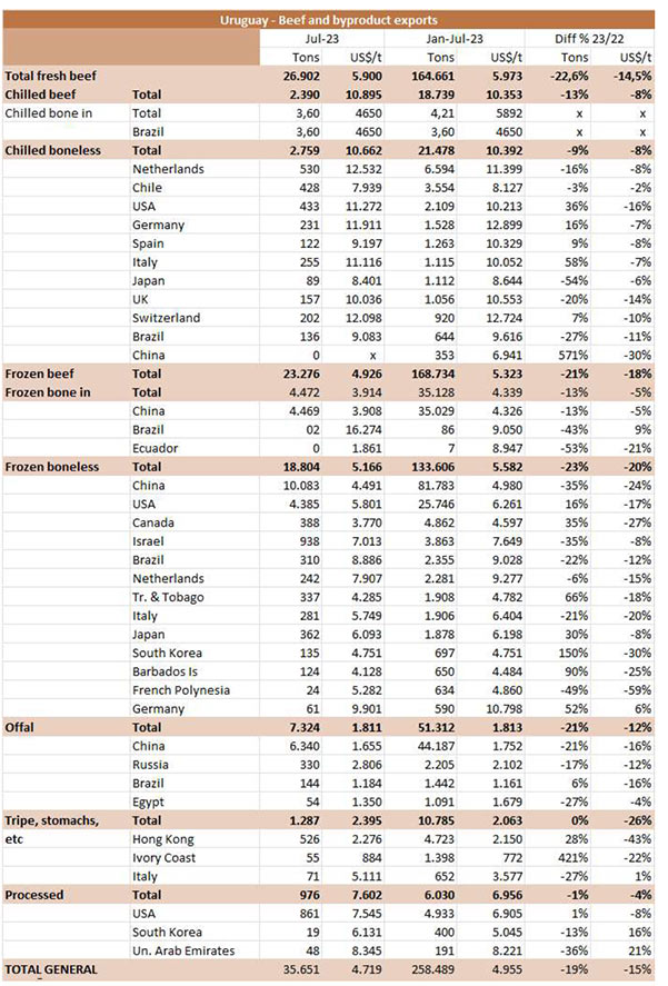 烏拉圭7月份出口了26038噸牛肉,和六月份的數(shù)據(jù)相似,比2022年7月增加了約1500噸。這是今年出口同比增長的第一個月,平均出口價格為每噸5534美元,比上月下降了240美元(-4.2%),是今年迄今為止的最低月度平均值。