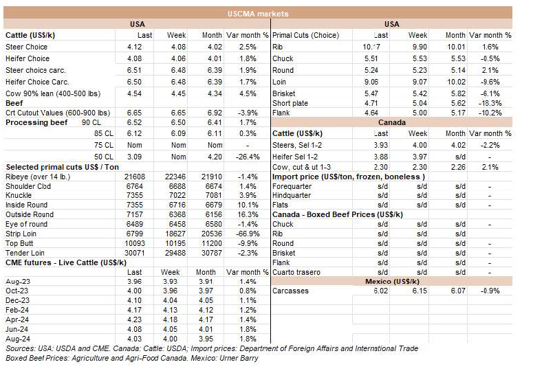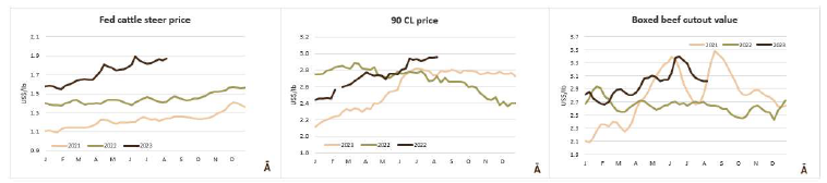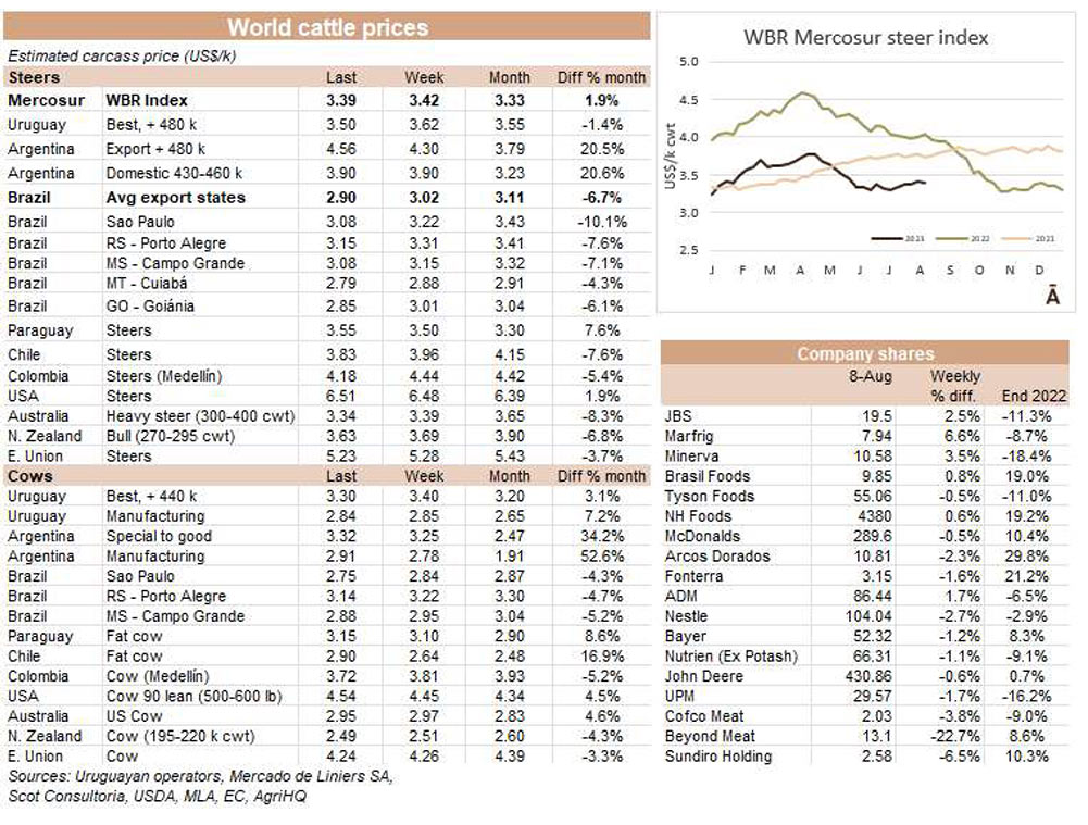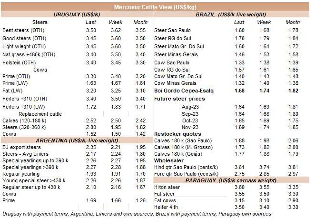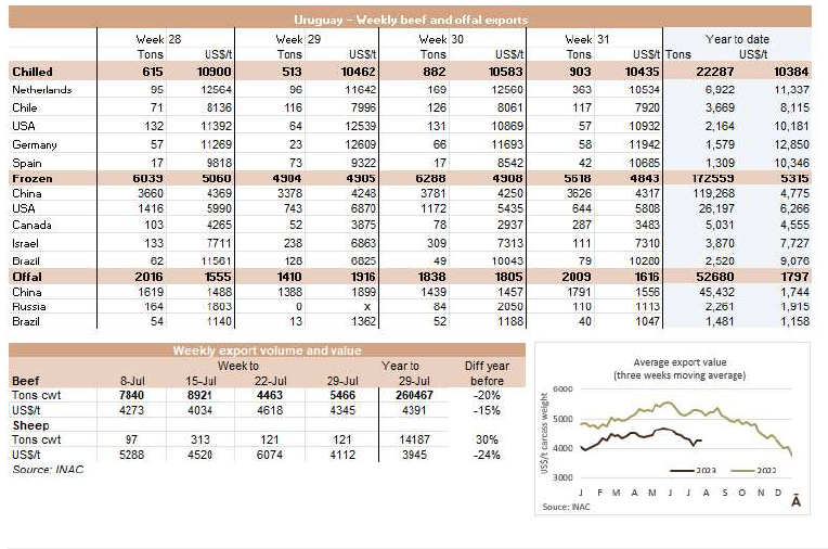 上周屠宰量大幅上升。INAC報告稱,截至8月6日,有45086頭牛進(jìn)入屠宰場,比上一次增加了5500頭,是自5月中旬以來的最高值。屠宰的組成比例清楚地反應(yīng)了481配額。小母牛是增長數(shù)量最多的,總共有7067頭,這是自2月份以來的最高值。本周,公牛增加2700頭達(dá)到了21112頭。不屬于配額的奶牛僅占屠宰量的36%,有16188頭。本周屠宰最多的工廠是Marfrig-Tacuarembo(5140)、Las Piedras(4853)和Ontilcor(4247)。7月份屠宰量是169558頭牛,同比增長了13.6%。這是自2022年5月以來,年度牛屠宰量首次增加。