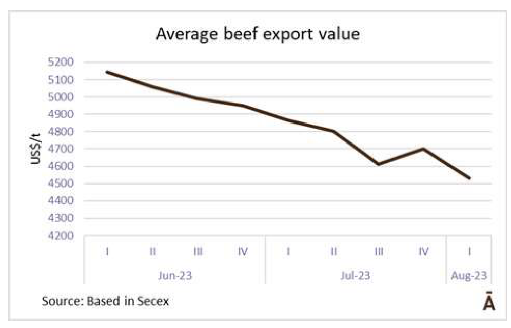 據(jù)外貿(mào)部(Secex)報告,8月前四個工作日,巴西出口了41267噸牛肉,平均價格為4532美元/噸。平均日產(chǎn)量為10317噸,為6月第一周以來的最高值。自6月初以來平均出口值呈下降趨勢,價格下跌了12%,即613美元/噸。