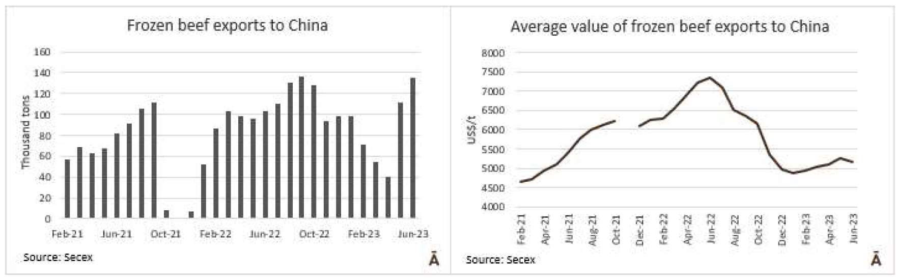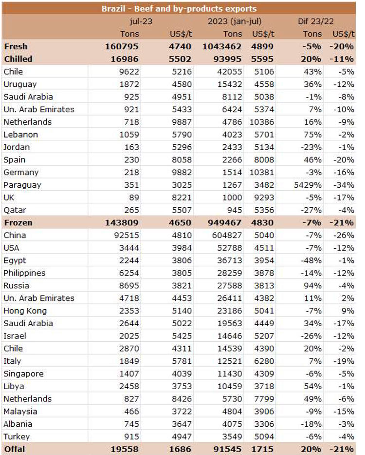 7月份,巴西對中國的冷凍牛肉平均出口價格為4810美元/噸,比6月份的平均出口價格每噸低350美元(-6.8%),為16個月前2021年3月以來的最低值。7月份中國出口量環(huán)比下降4.3萬噸至92515噸。無論如何,到目前為止,中國仍然是巴西冷凍牛肉的主要出口國,占比為64%。本月冷凍牛肉第二大目的地是俄羅斯(8695噸)。