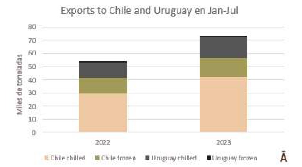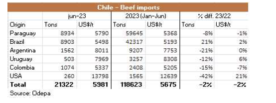 由于智利牛肉進(jìn)口牛價格的下降,巴西牛肉在國際市場上表現(xiàn)出競爭力。根據(jù)Odepa的數(shù)據(jù),6月份,8903噸巴西牛肉抵達(dá)智利,這是今年迄今為止的最高月度產(chǎn)量,與巴拉圭的牛肉數(shù)量持平。來自哥倫比亞的牛肉量也大幅增加,達(dá)到1074噸,是過去至少兩年來的最高出口量。2023年上半年,智利進(jìn)口了59645噸牛肉,比2022年同期減少了8%。