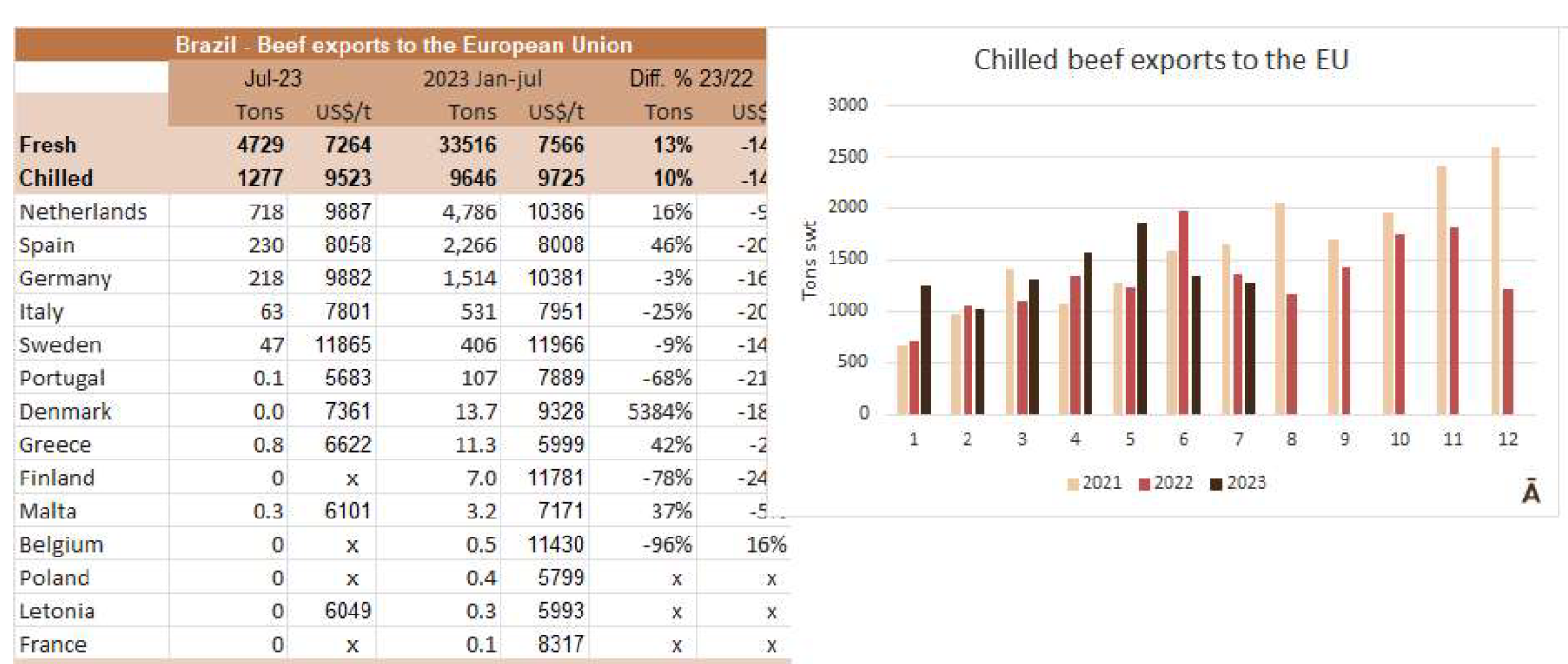 巴西向歐盟國家出口了1277噸冰鮮牛肉,比6月份減少了70噸,是自2月份以來的最低出口量。當(dāng)月凍結(jié)出口累計3452噸,比6月份增加464噸。