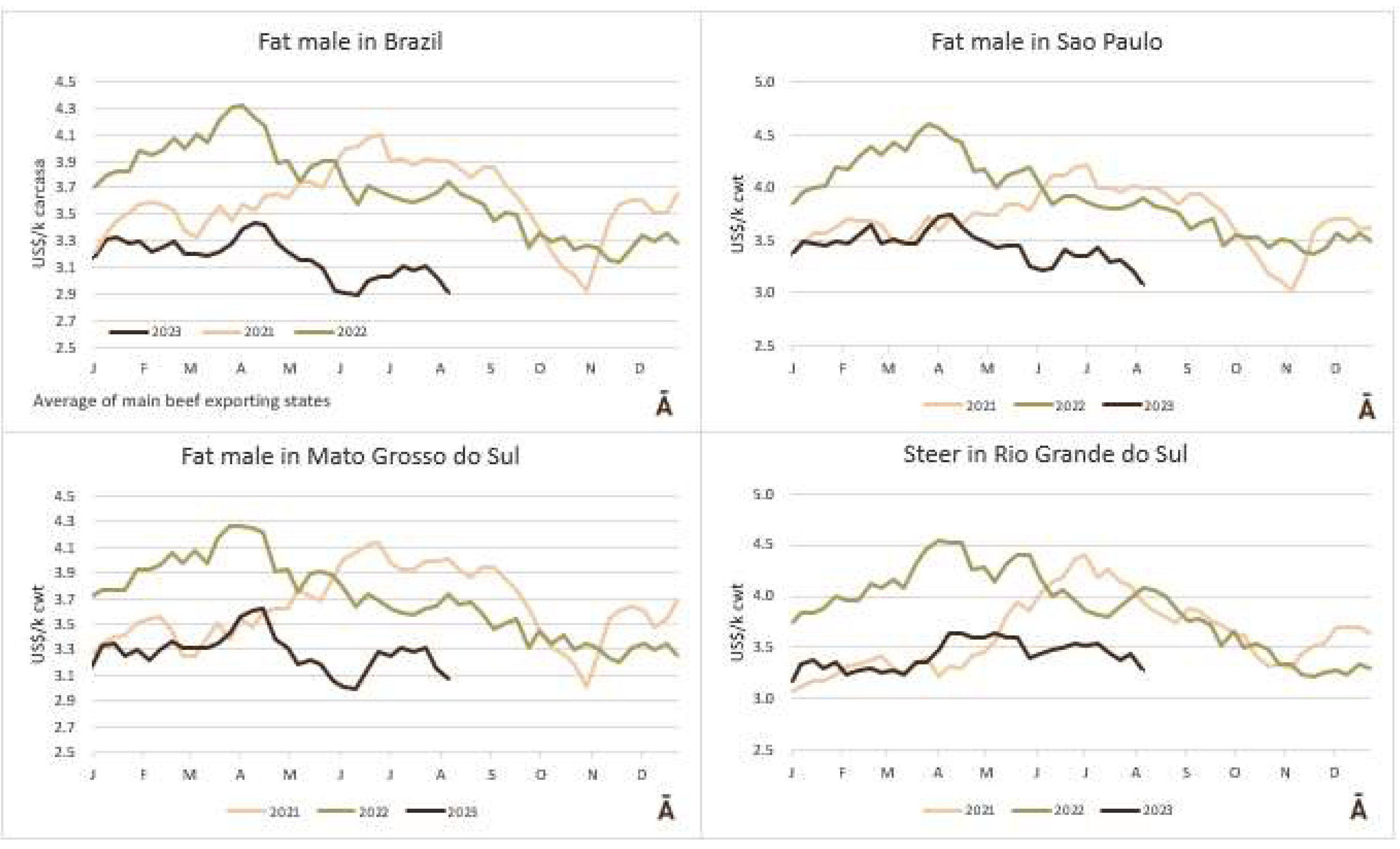 屠宰牛價格本周繼續(xù)呈下降趨勢。根據(jù)蘇格蘭咨詢公司的參考資料,在圣保羅本周初,公牛價格是226.5雷亞爾/15公斤免稅,30天內(nèi)付清,比上一次低了5雷亞爾。所謂的屠宰時不到30個月“中國?!保鐑r5雷亞爾/15公斤的報價,本周也下跌了R$5/15公斤。巴西的主要養(yǎng)牛州平均價格為195.7雷亞爾/15公斤,比上周下降了1.2雷亞爾。批發(fā)市場的牛肉價格在本月前幾天上漲后略有回落。