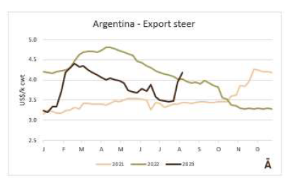 在阿根廷,價格繼續(xù)迅速上升??紤]官方匯率并增加9%的牛肉出口稅,本周出口公牛增加了26美分,上兩周增加了77美分,每公斤胴體重量為4.56美元。