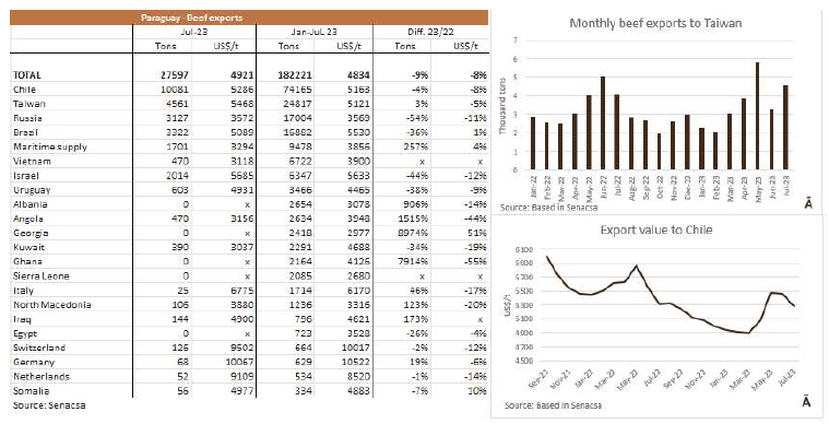根據(jù)Senacsa的數(shù)據(jù),巴拉圭7月份以4921美元/噸的平均價格出口了27597噸牛肉。比6月份增加了1300噸,同比減少了8000噸(-22%)。與上個月相比,每噸的平均價格下降了100美元多一點,這是連續(xù)第二個月出現(xiàn)收縮,落后于2月至5月的持續(xù)上升趨勢,在此期間,價格回升了500美元/噸。對于智利的出口價格的下降,巴拉圭主要客戶這個月平均價格下降了180美元/噸。作為巴拉圭牛肉的第二大目的國的臺灣,今年迄今為止的出貨量增長了3%,而年出口總額則下降了9%。